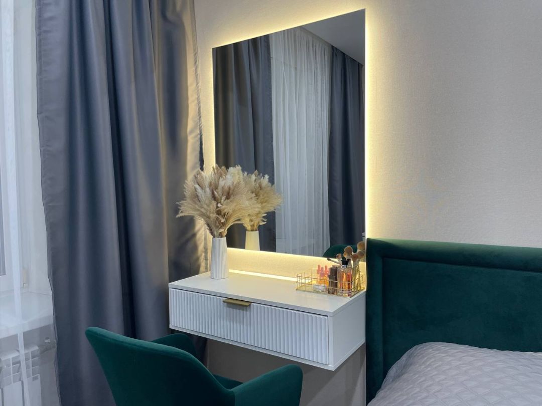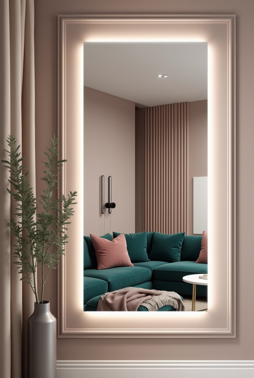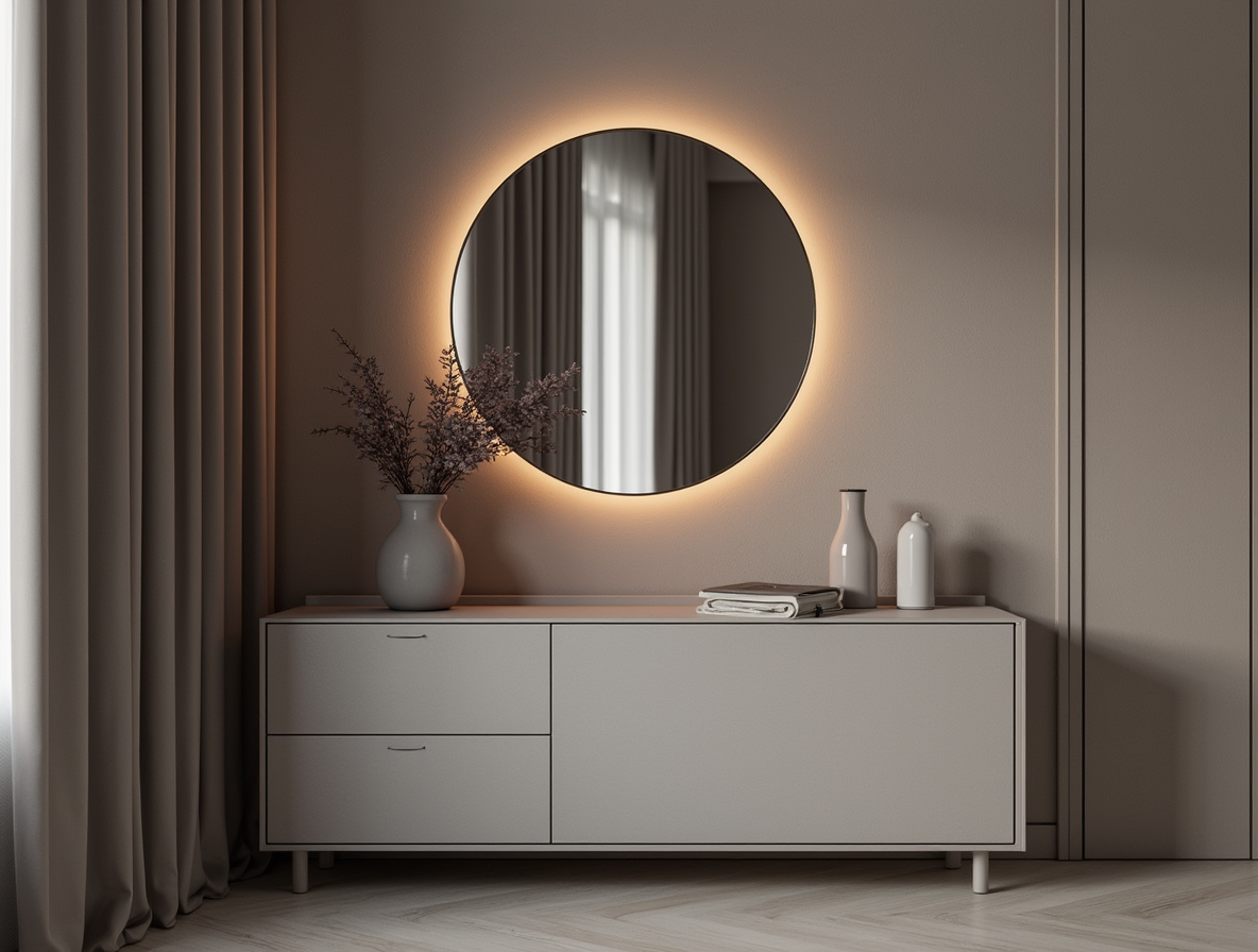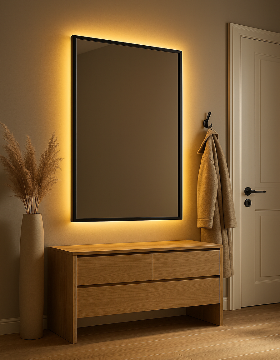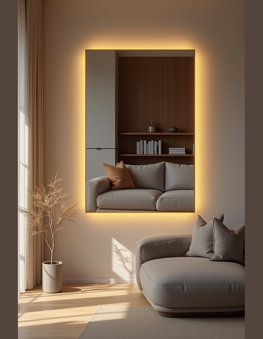 Интерьерное зеркало с эффектом парения — мягкий свет выходит из-за стекла, создавая тёплую атмосферу.